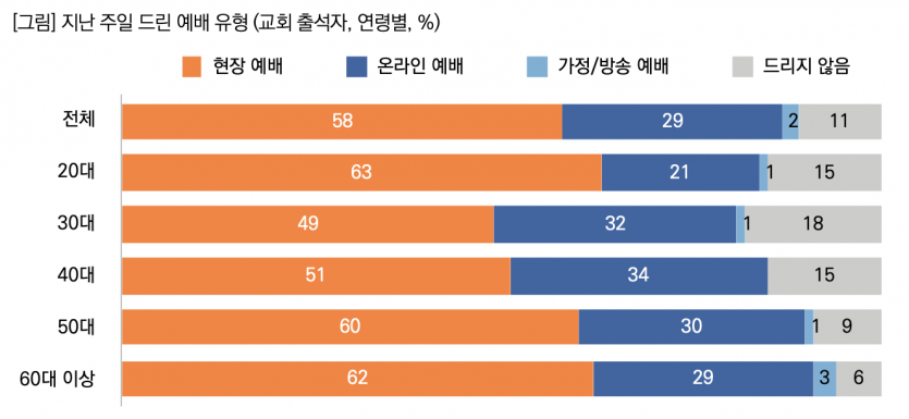 ‣ 연령별 현장예배 참석률은 30대와 40대를 제외한 모든 연령층에서 60% 안팎의 참석률을 보이는데, 30대는 49%, 40대는 51%로 타 연령층 대비 10%포인트 정도의 격차를 보이고 있다. 이들은 온라인 예배로 빠지거나 아예 예배를 드리지 않은 것으로 조사됐다.
