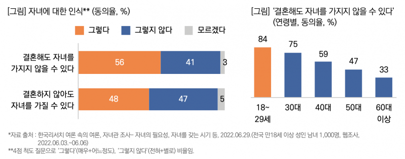 ‣ 사람들은 결혼 후 자녀를 갖는 것에 대해 어떤 생각을 갖고 있을까? ‘결혼해도 자녀를 가지지 않을 수 있다’는 의견에 대해 국민의 56%가 동의하는 것으로 나타났다. 이와 같은 인식은 연령별로 큰 격차를 보이는데, 20대층에서는 대부분(84%)이 동의하고 있으나, 60세 이상 고령층에서는 동의율이 33%에 불과했다.