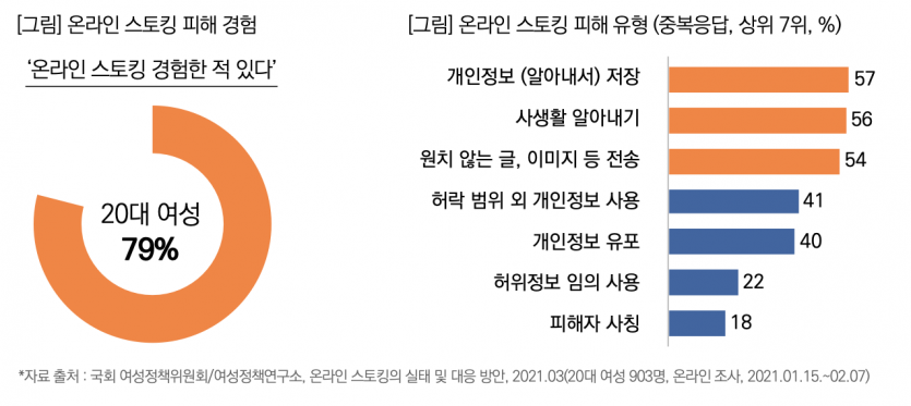 ‣ 한국여성정치연구소가 20대 여성을 대상으로 조사한 ‘온라인 스토킹의 실태 및 대응 방안’ 보고서에 따르면 10개의 ‘온라인 스토킹 피해 유형’ 중 1개 이상 경험했다고 응답한 비율이 79%에 달했다. 20대 여성 10명 중 8명꼴로 ‘온라인 스토킹’ 피해를 당한 것이다. (앞에서 여성폭력 실태조사의 스토킹 경험률과 상이한 것은 이 조사의 경우 10개의 스토킹 사례를 제시한 후 해당사항에 체크하게 한 것으로 이런 경우 경험률이 크게 올라갈 수 있음에 유의할 것)