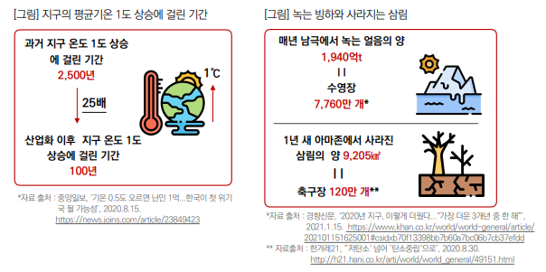 • 매년 남극에서 녹는 얼음의 양은 수영장 7,760만 개를 채울 수 있을 정도이고, ‘지구의 허파’로 불리는 아 마존에서 1년 새 사라진 삼림의 양은 축구장 120만 개의 크기에 달한다.