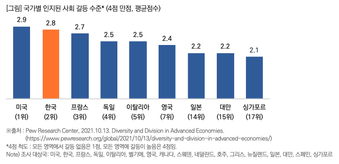• 이러한 한국의 사회 갈등은 다른 나라와 비교해서 어떠할까? 미국의 퓨리서치센터는 17개국 대상으로 사회 갈등에 대한 조사를 실시하여 그 결과를 발표했는데, 한국은 미국 다음으로 사회 갈등 지수가 가장 높은 국가로 나타났다. 이는 아시아 국가 중 가장 높은 순위이다.