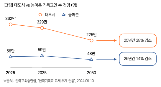 • 대도시와 농어촌의 기독교인 수 전망을 살펴본다. 대도시 기독교인 수는 2025년 362만 명에서 2050년 225만 명까지 지속적으로 하락하여 25년간 38% 감소할 것으로 전망된다.