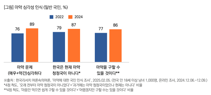 • 또한 현재 한국이 ‘마약 청정국이 아니다’라는 응답은 87%, ‘마약을 구할 수 있을 것이다’ 86%로 나타났는데 2년 전 대비 각각 8~9%p 증가한 수치를 기록해 전반적으로 국내 마약 문제 상황을 심각하게 보는 인식이 더 높아진 것으로 나타났다.
