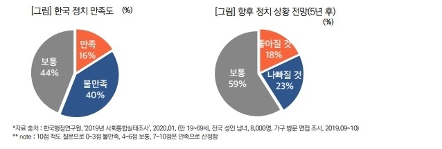 • 우리 국민은 한국 정치에 대해 만족 16%, 불만족 40%로 매우 낮은 만족도를 보이고 있음